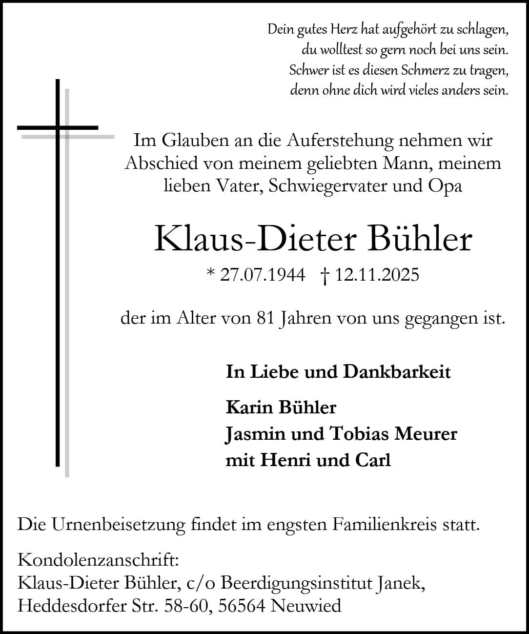 Klaus-Dieter Bühler wurde am 27.07.1944 in Neuwied geboren. Im Alter von 81 Jahren verstarb Herr Bühler am 12.11.2025 in Koblenz.