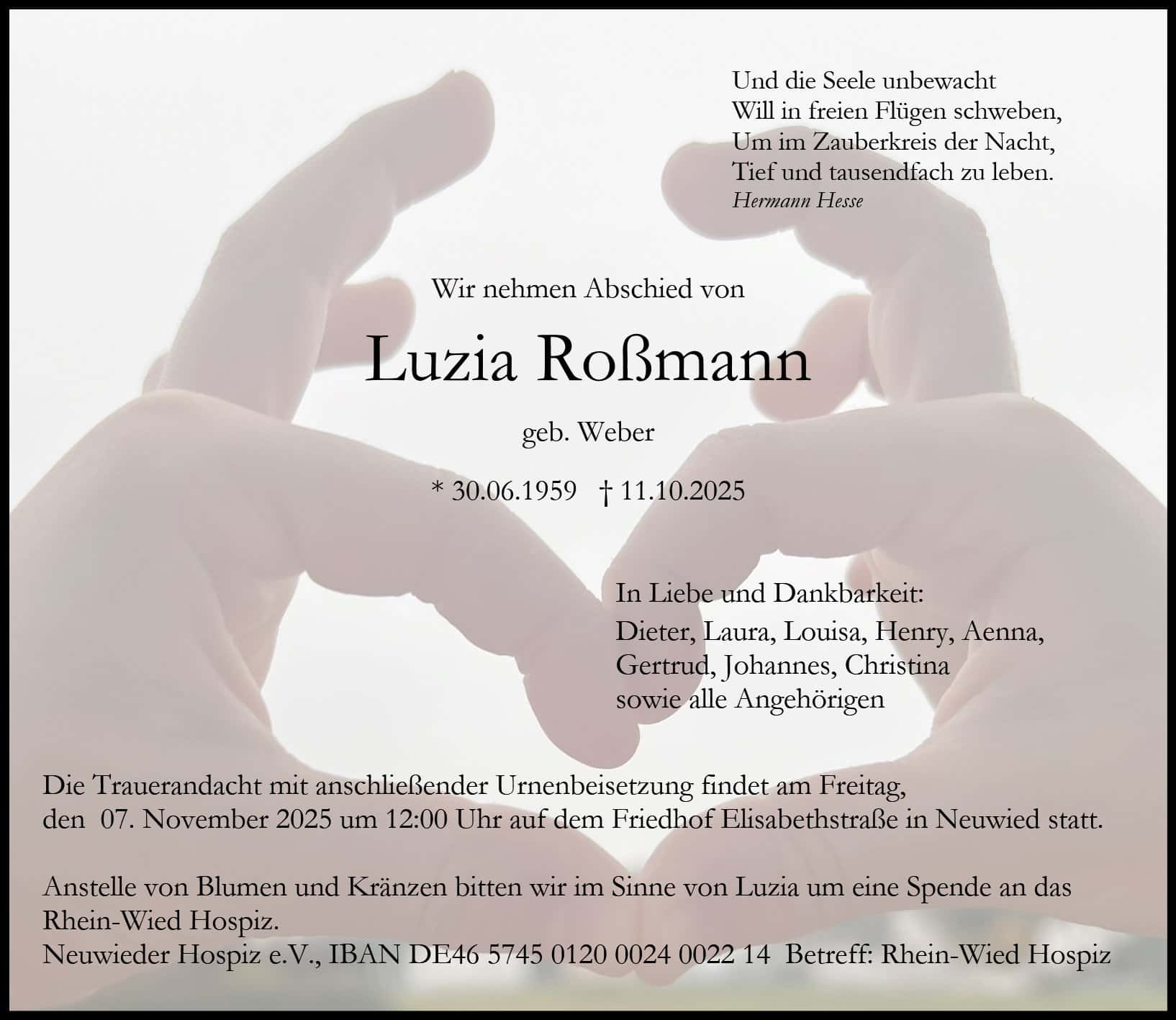Luzia Roßmann, geb. Weber wurde am 30.06.1959 in Gillenfeld geboren. Im Alter von 66 Jahren verstarb Frau Roßmann am 11.10.2025 in Neuwied.