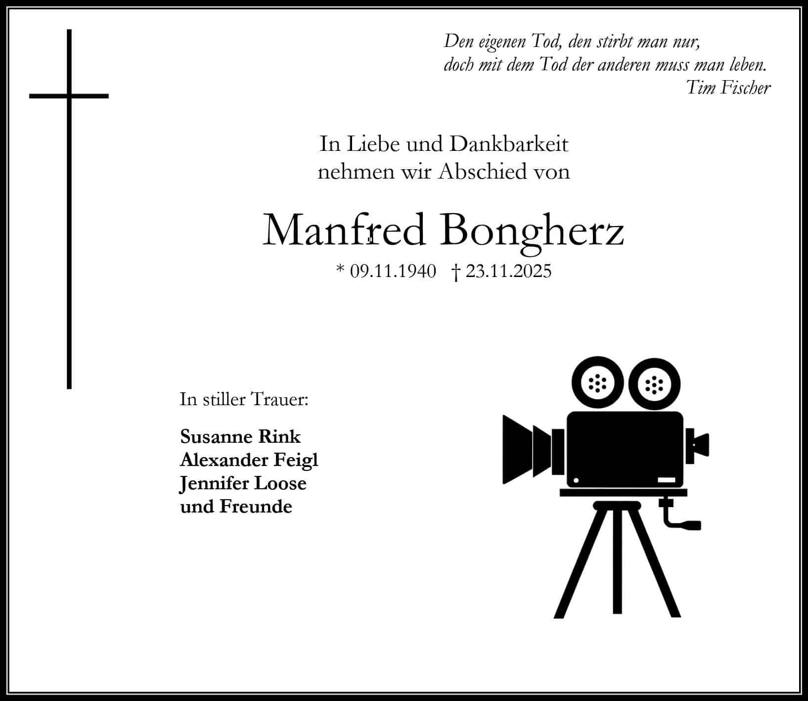 Manfred Bongherz Manfred Bongherz wurde am 09.11.1940 in Neuwied geboren. Im Alter von 85 Jahren verstarb Herr Bongherz am 23.11.2025 in Neuwied. Den Verlust betrauern alle die Ihn kannten. Beerdigungsinstitut Janek2025-11-28T10:23:36+01:000 Kommentare FacebookWhatsAppE-Mail KondolenzbuchAntwort abbrechen