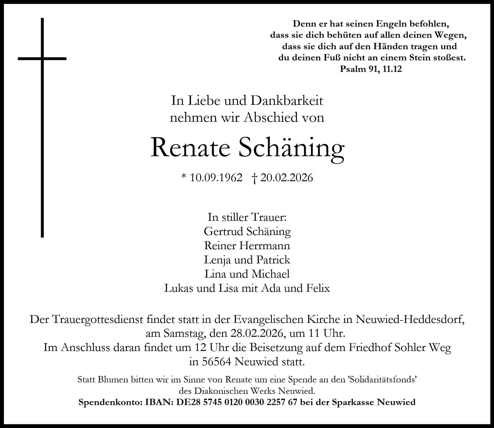 Der Trauergottestdienst findet statt in der evangelischen Kirchen in Neuwied-Heddesdorf, am Samstag, den 28.02.2026, um 11 Uhr.